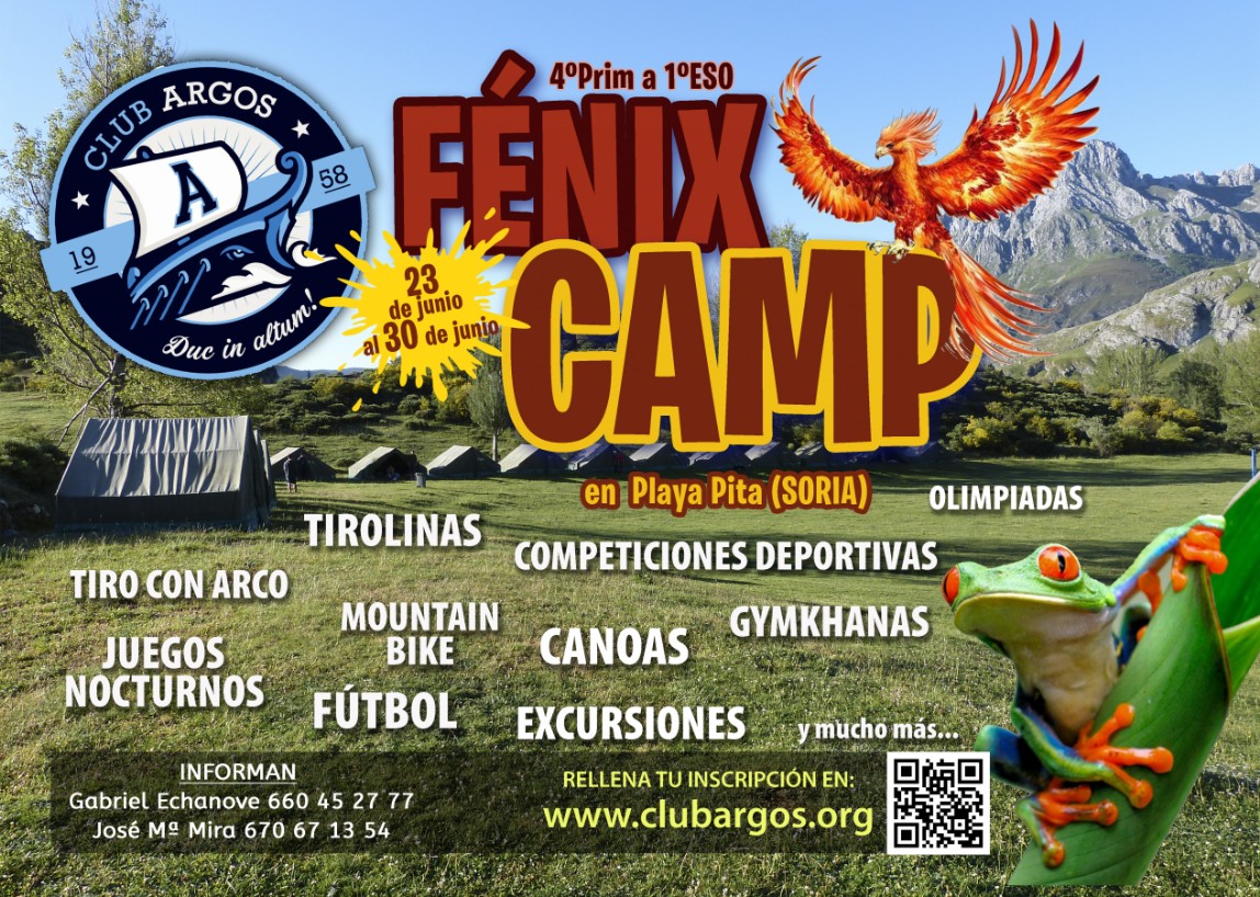 Al comienzo del verano, Argos organiza un campamento en la provincia de Soria para chicos de edades comprendidas entre los 9 y los 12 años. Cuando se pasan unos días inolvidables en un ambiente de diversión y de compañerismo, es más fácil adquirir o afirmar virtudes que difícilmente se pueden desarrollar en unos días ociosos y planos. Por eso, en el Fénix Camp se procura que los asistentes adquieran puntos concretos de mejora, como ayudar en casa, llevar al día las tareas del verano, preocuparse por los demás, fomentar las aficiones…